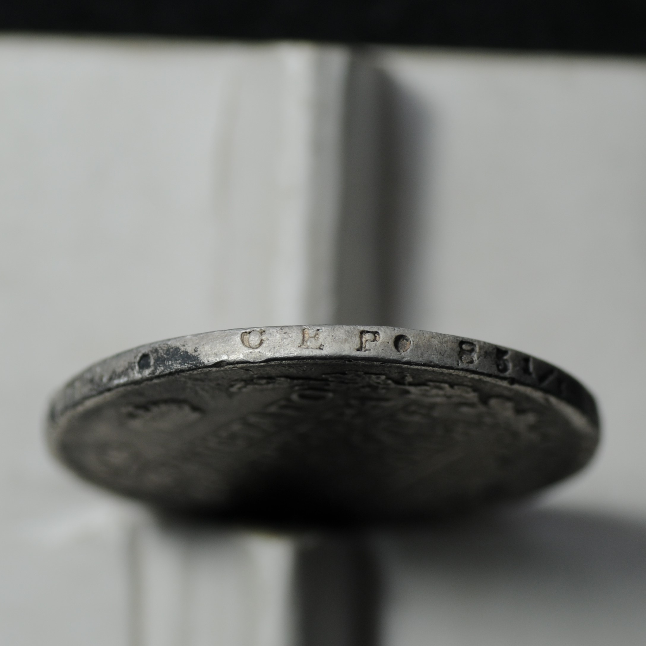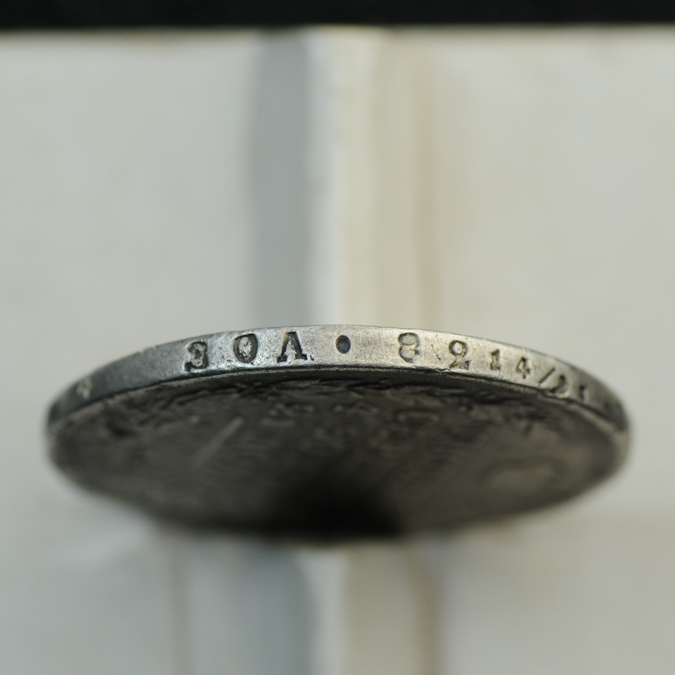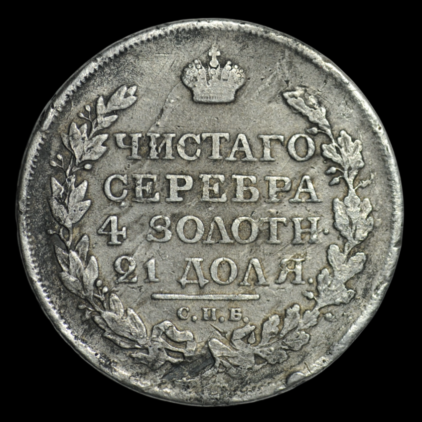 Реверс: в центре надпись в четыре строки: «ЧИСТАГО│СЕРЕБРА│4 ЗОЛОТН.│21 ДОЛЯ.». Над надписью — императорская корона. Под надписью — прямая черта, под ней— обозначение Санкт-Петербургского монетного двора «С.П.Б.». Вдоль канта, не доходя до короны, изображен венок из лавровой и дубовой ветвей, которые в нижней части переплетены лентой. По окружности канта имеются рельефные элементы, выполненные в виде зубцов.