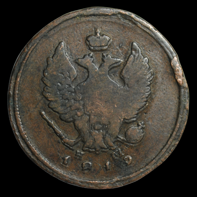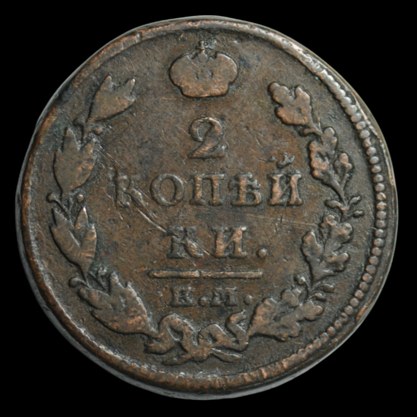 Медная монета 2 копейки 1812 года. Изготовлена из меди на Екатеринбургском монетном дворе в правление императора Александра I.