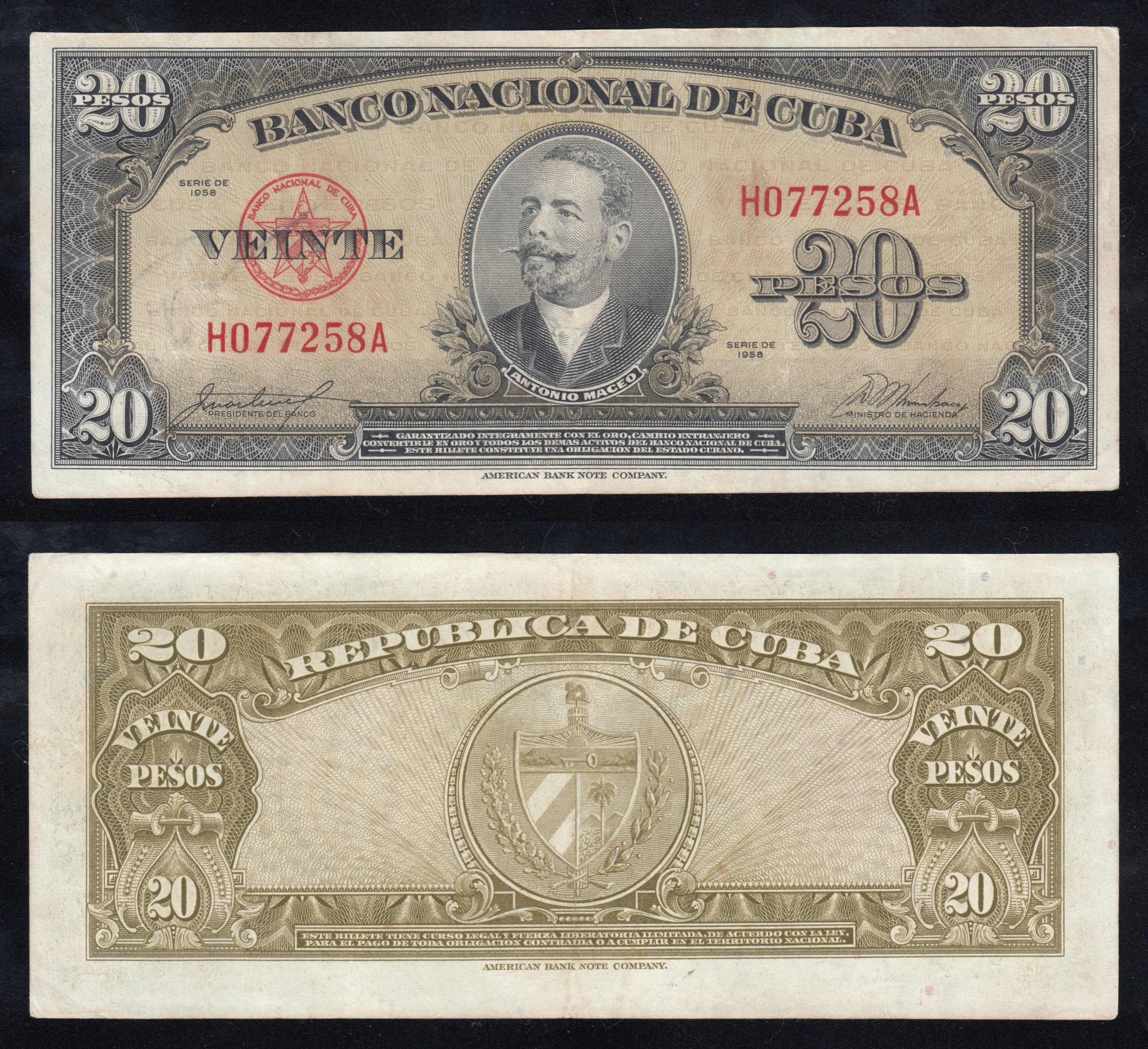 Банкнота (бона) номиналом 20 песо, выпущенная Национальным банком Кубы (Banco Nacional de Cuba) в 1958 году.