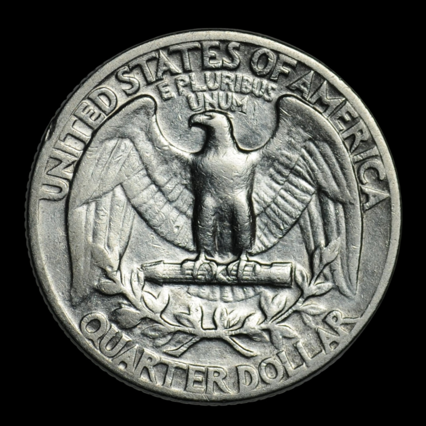 Монета США 25 центов (квотер) 1954 года. Отчеканена из серебра 900-й пробы на монетном дворе Филадельфии.