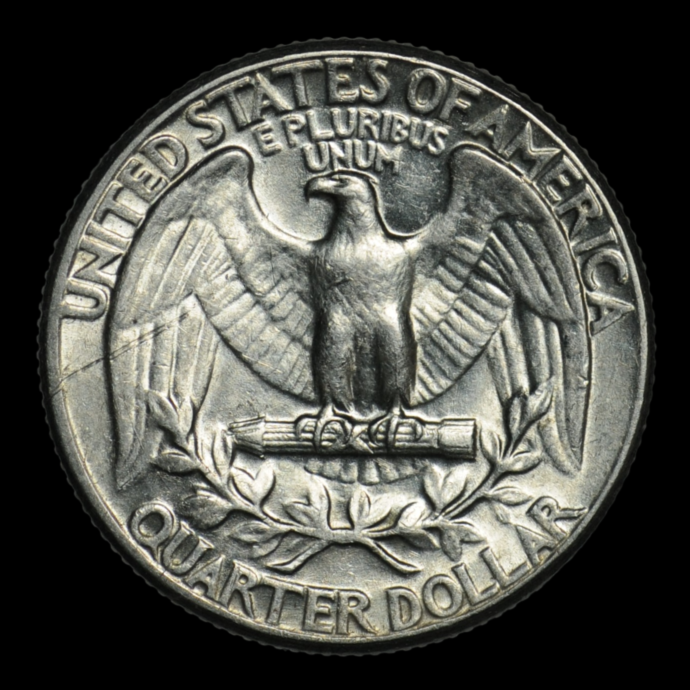 Реверс: В центре изображен белоголовый орлан — геральдический символ США, сидящий на связке прутьев (ликтор), под ним венок из двух оливковых ветвей; внизу номинал полукругом: "QUARTER DOLLAR" (ЧЕТВЕРТЬ ДОЛЛАРА). Вверху надпись полукругом: "UNITED STATES OF AMERICA". Над головой орлана надпись полукругом в две строки: "E PLURIBUS | UNUM" (Из многих — единое).