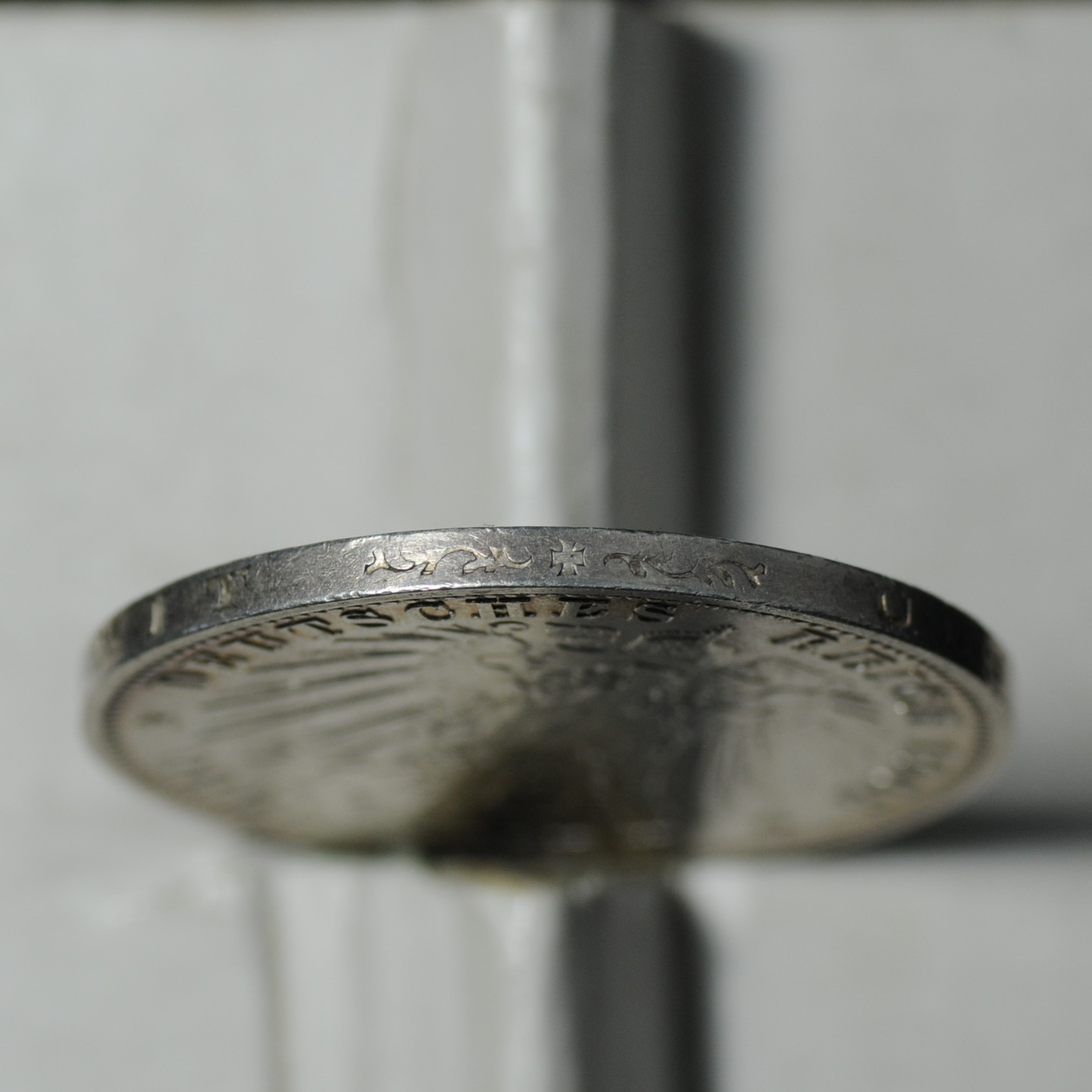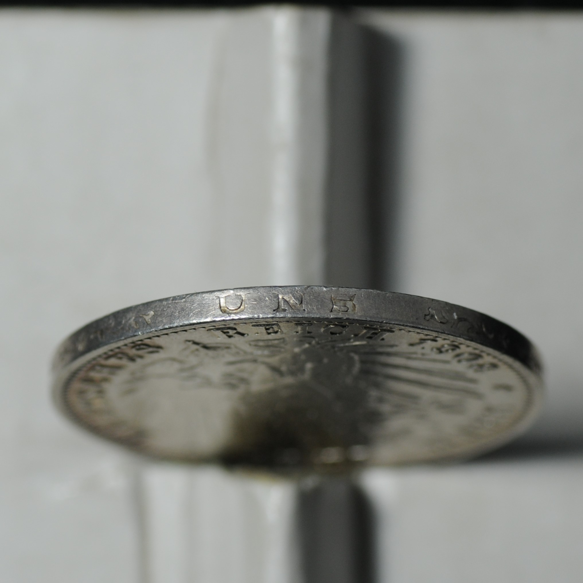 Аверс: в центре изображен герб Германской империи Рейхсадлер ("Имперский орел") - геральдический орел, производный от римского стандартного орла, использовавшийся императорами Священной Римской империи и в современных гербах Германии, включая гербы Второй Германской империи (1871-1918), Веймарской республики (1919-1933) и "Третьего рейха" (нацистской Германии). Германия, 1933-1945). Рейхсадлер уже был представлен при провозглашении Версаля, хотя первая версия была лишь предварительной. За время существования Германской империи (1871-1918) дизайн орла менялся по меньшей мере дважды. На нем изображен императорский орел, сравнительно реалистичный черный орел без скипетра и державы, на нагрудном щите - прусский орел, наложенный на щит дома Гогенцоллернов с германской государственной короной. У орла красный клюв, язык и когти, распростертые крылья и перья. В отличие от своего предшественника, орла Германской конфедерации, у него только одна голова, обращенная вправо, что символизирует то, что важные части старой империи, Австрия и Богемия, не были частью этой новой империи. Круговая надпись: "DEUTSCHES REICH 1908 DREI MARK".