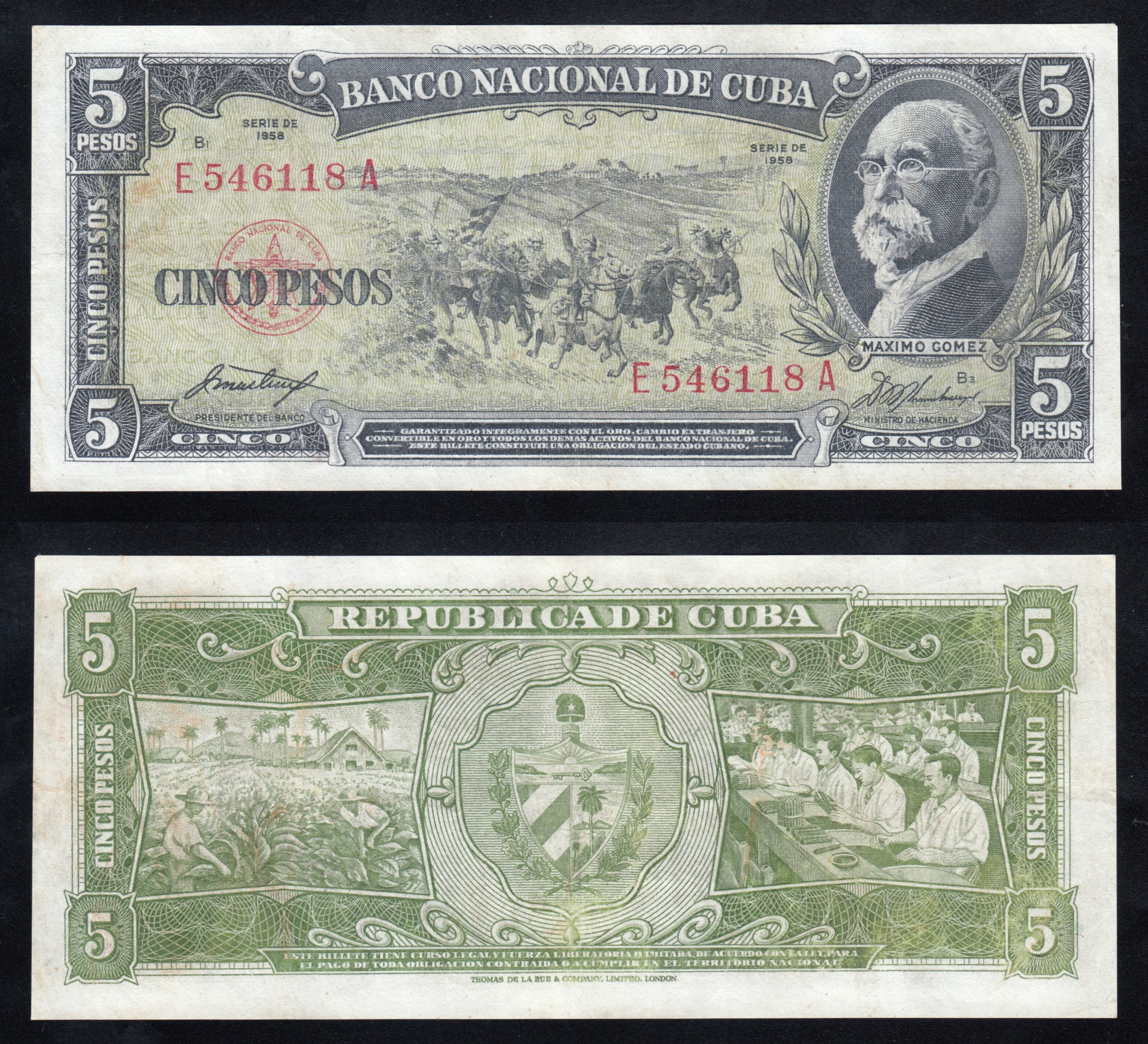 Банкнота (бона) номиналом 5 песо 1958 года Кубы.