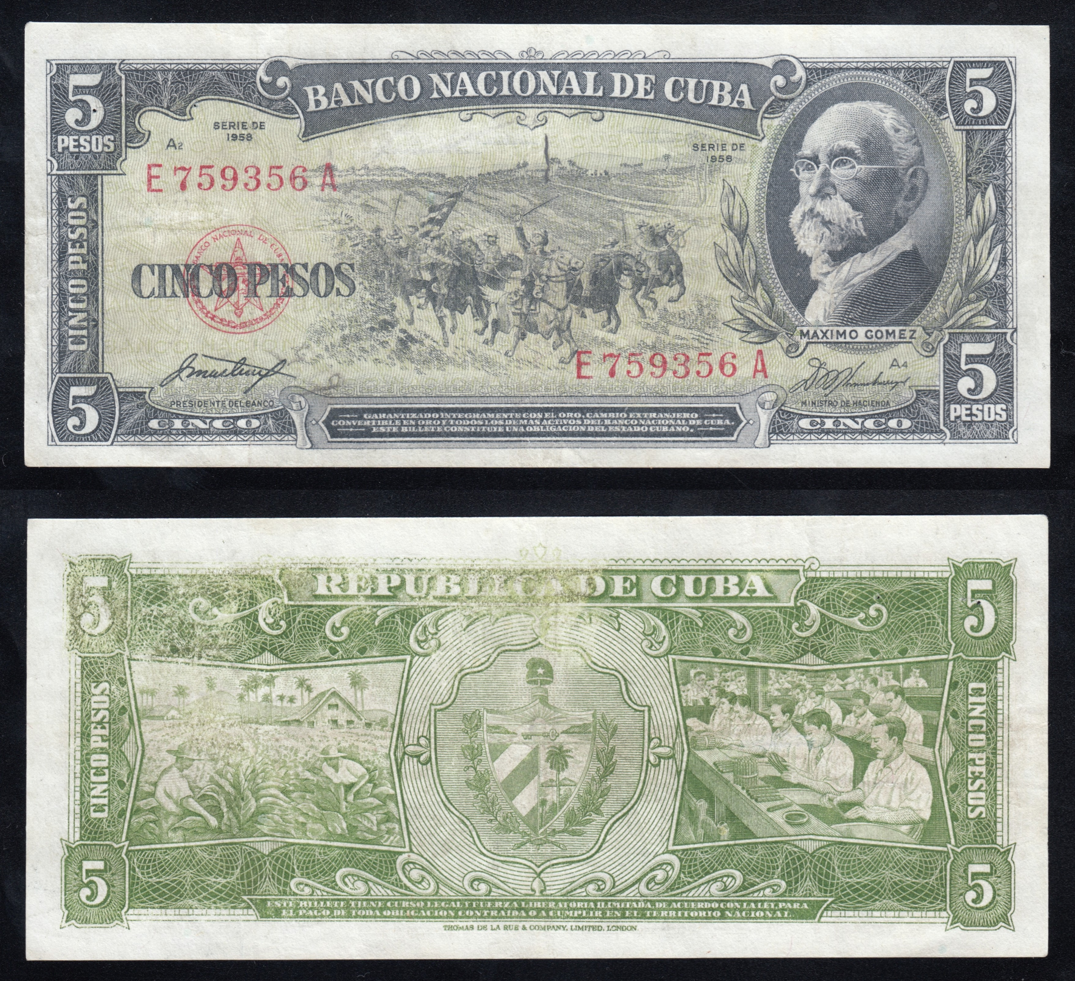 Банкнота (бона) номиналом 5 песо 1958 года Кубы.