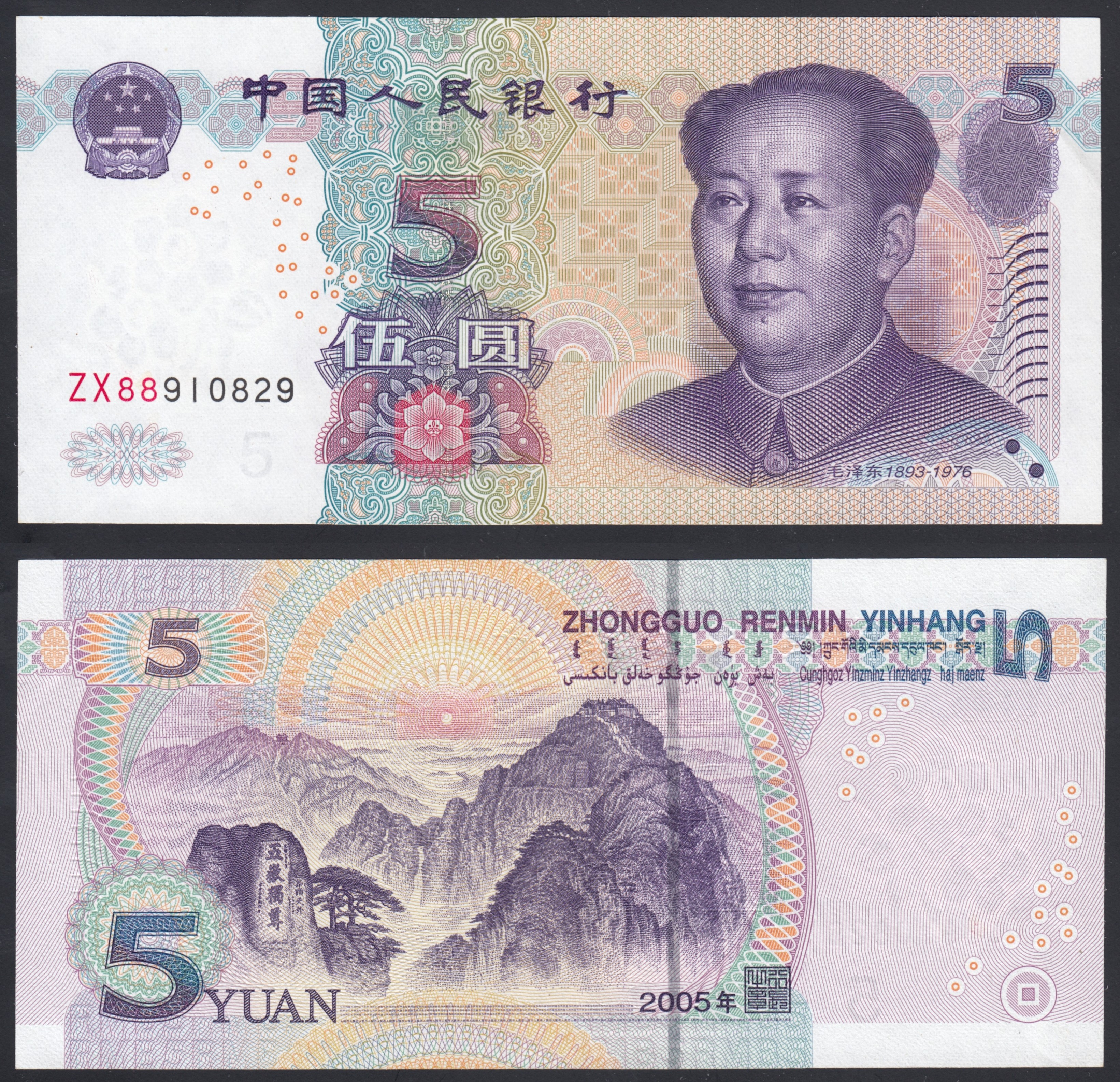 Лицевая сторона (Аверс): На банкноте изображен портрет Мао Цзэдуна (1893-1976). Слева от портрета расположен герб Китая и надпись «Народный банк Китая» на китайском языке. Также присутствует цифровое обозначение номинала «5» и иероглифы, обозначающие «Пять юаней». Основной цвет банкноты — фиолетовый.