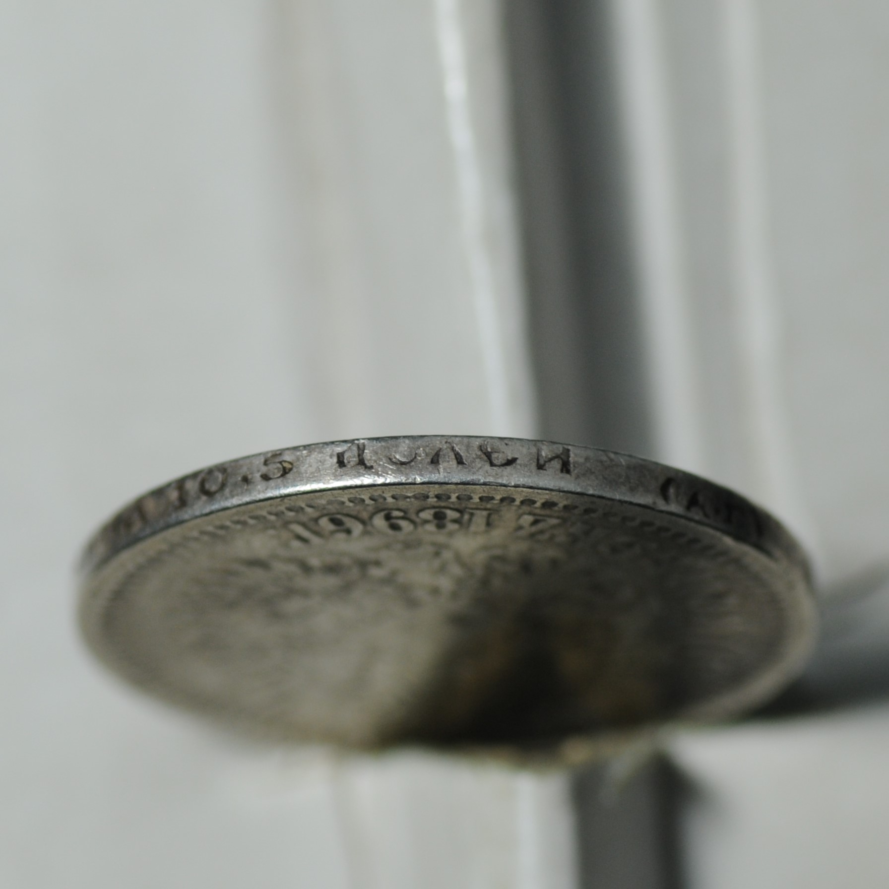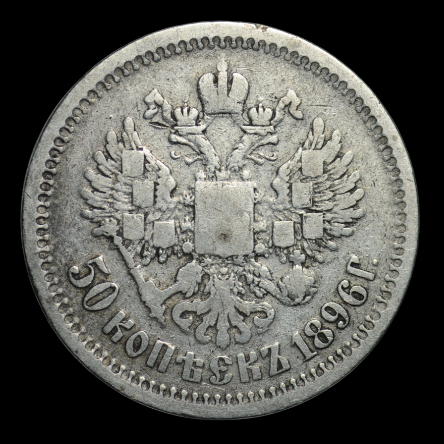 Монета 50 копеек 1896 года, отчеканена на Санкт-Петербургском монетном дворе в период правления Николая II, последнего российского императора. Материал - серебро 900 пробы. Инициалы минцмейстера АГ (Апполон Грасгоф).