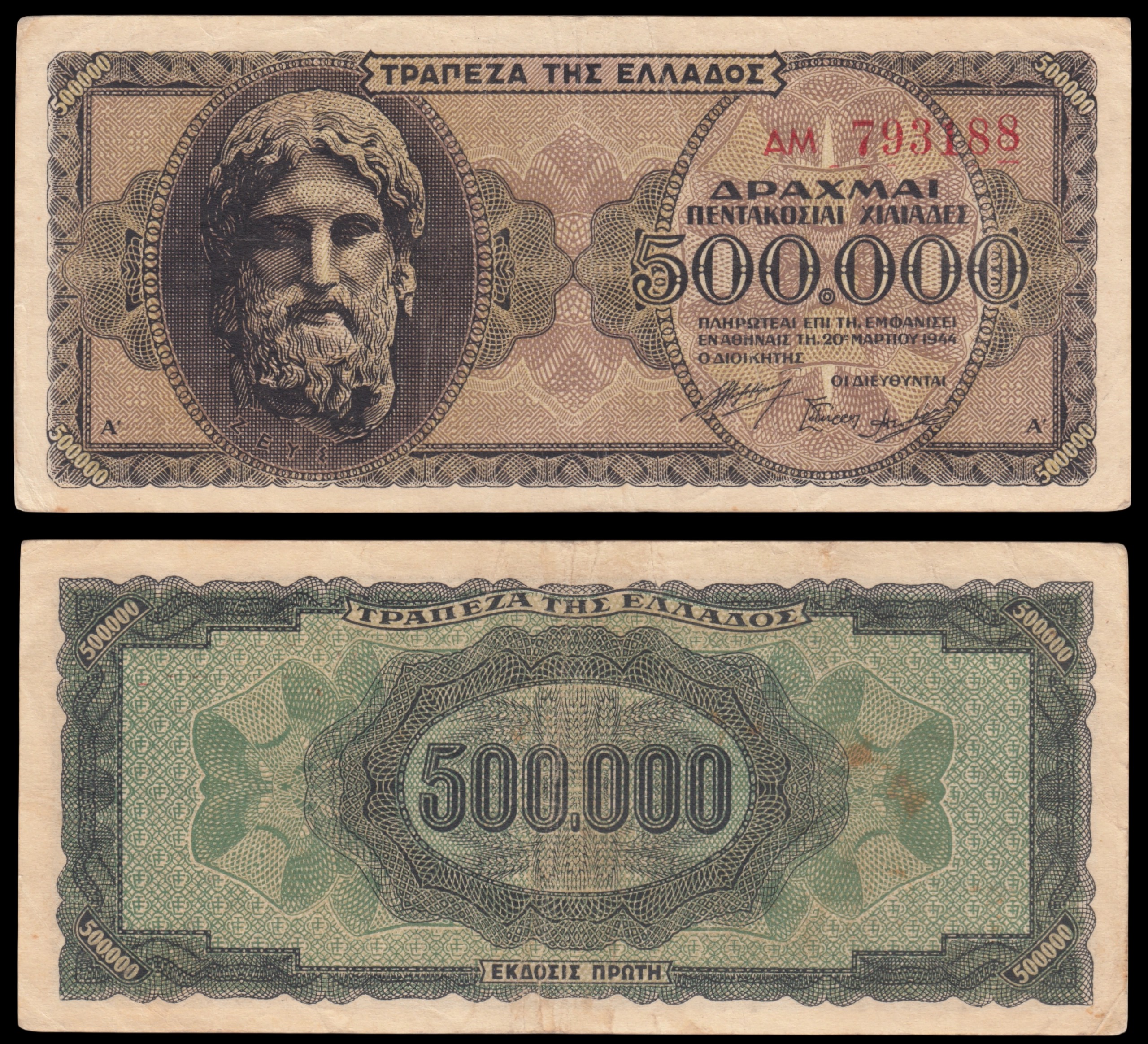 Банкнота (бона) номиналом 500 000 греческих драхм 1944 года выпуска. Банкнота была выпущена в период немецкой и итальянской оккупации Греции во время Второй мировой войны, в условиях сильной инфляции. Из-за обесценивания валюты оккупационные власти были вынуждены печатать банкноты с огромными номиналами.
