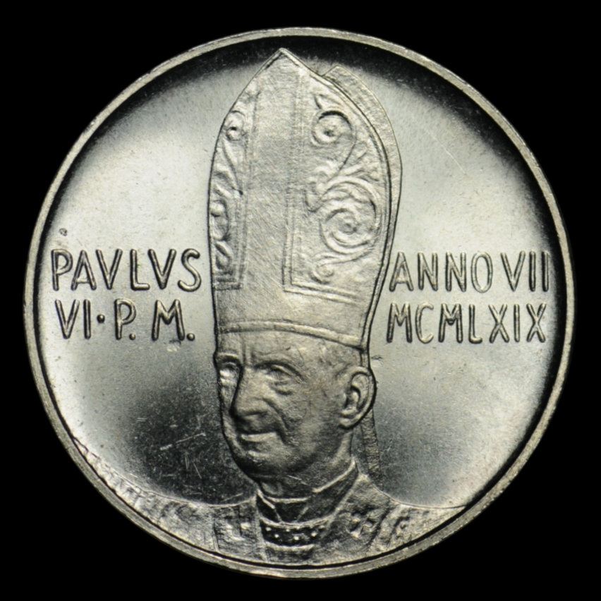 Аверс: В центре портрет Папы Римского Павла VI. Папа Римский Павел VI (урождённый Джованни Баттиста Энрико Антонио Мария Монтини; 26 сентября 1897 — 6 августа 1978) был главой Католической церкви и сувереном Ватикана с 21 июня 1963 года до своей смерти 6 августа 1978 года. Слева надпись в две строки: "PAVLVS VI P M" ( Павел VI Папа Римский). Справа, надпись: "АNNO VII" (Год папства седьмой), ниже год чеканки римскими цифрами: "MCMLXIX" (1969).