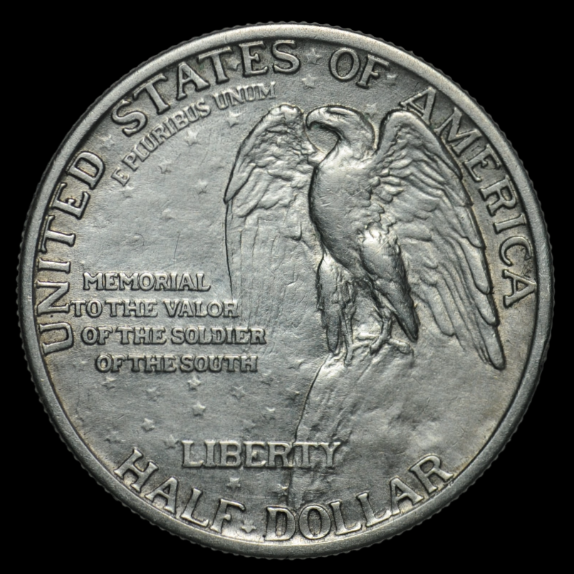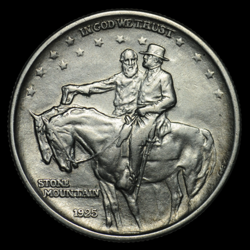 Памятная серебряная монета 1/2 доллара 1925 года США. Монета была выпущена для сбора средств на завершение масштабного мемориала конфедератам - гигантского барельефа на горе Стоун-Маунтин в штате Джорджия. Эта монета стала первой в США, посвященной событиям Гражданской войны.