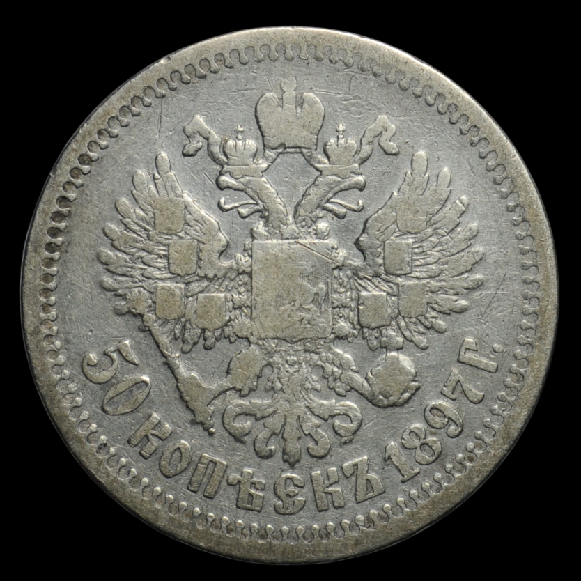 Монета 50 копеек 1897 года, отчеканена на Парижском монетном дворе (*) по заказу российского правительства в период правления Николая II, последнего российского императора. Материал - серебро 900 пробы.
