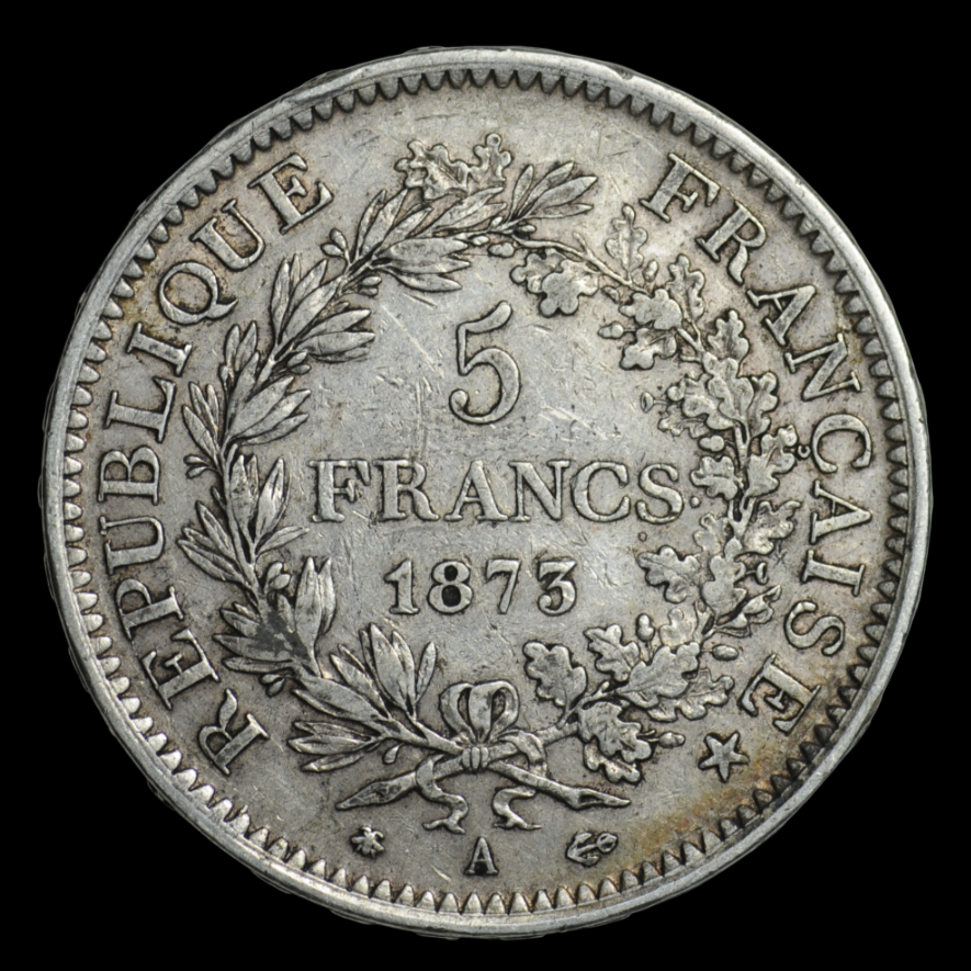 Реверс: в центре, в венке из оливковой слева и дубовой справа ветвей номинал цифрой "5", достоинство "FRANCS" и год чеканки "1873" в три строки. По краю монеты название государства: "RЕPUBLIQUE FRANÇAISE" (Республика Франция). Внизу, под венком клеймо директора монетного двора Парижа Альфреда Ренуара де Бюссьера (Alfred Renouard de Bussiere) - пчела. Знак Парижского монетного двора литера: "А" и клеймо главного гравера Альберта Дезире Барре (Albert Dеsirе Barre) - якорь.