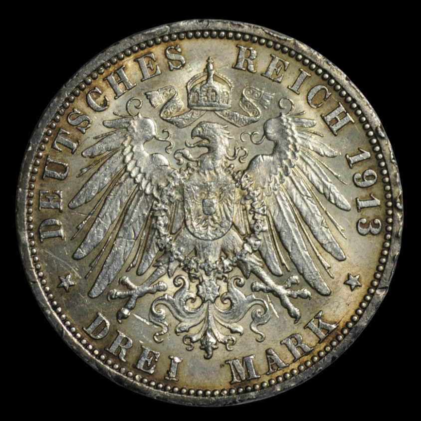 Реверс: в центре герб государства с так называемым большим орлом. Над орлом германская императорская корона с двумя развевающимися концами ленты, на груди орла щит с гербом Пруссии, вокруг щита – прусский орден Черного Орла с цепью. Круговая надпись: "DEUTSCHES REICH 1913 DREI MARK".