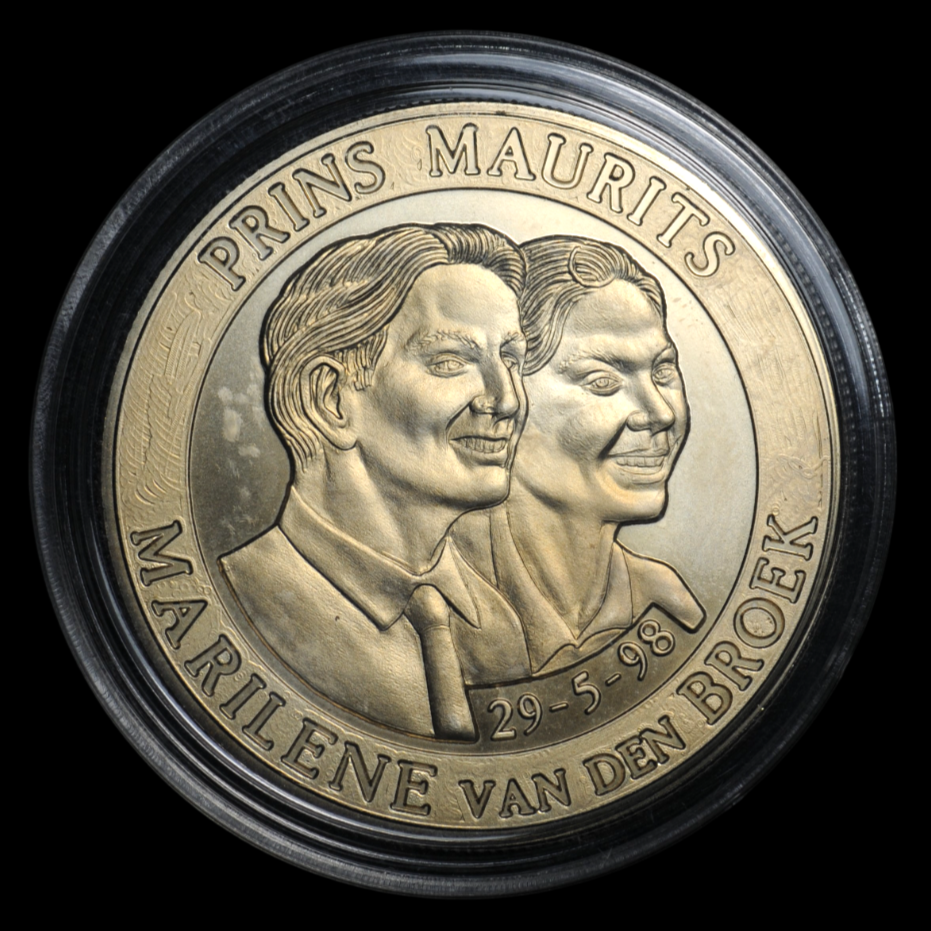 Реверс: во внутреннем круге полупрофили принца Морица и Марилинв право. Внизу справа полукругом дата бракосочетания: "29-6-98". Во внешнем круге сверху титул и имя жениха: "PRINS MAURITS" (Принц Мориц), внизу имя и девичья фамилия невесты: "MARILENE VAN DEN BROEK" (Марилин ван ден Брук).