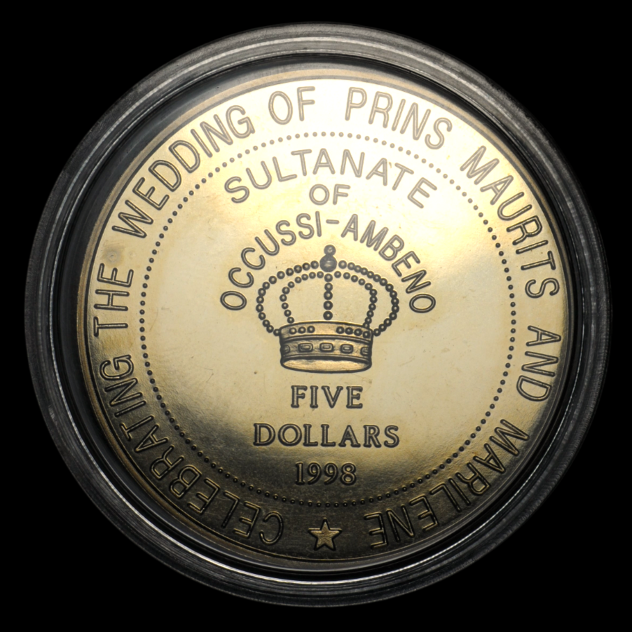 Аверс: во внутреннем круге, отделенном ободком из точек, в центре корона, над ней полукругом в три строчки надпись названия султаната: "SULTANATE OF OCCUSSI-AMBENO". Под короной номинал и достоинство прописью, в две строчки: "FIVE DOLLARS" и ниже год чеканки: "1998". Во внешнем круге, разделенная пятиконечной звездой, надпись: "CELEBRATING THE WEDDING OF PRINS MAURITS AND MARILENE" (Празднование свадьбы принца Морица и Марилин)".